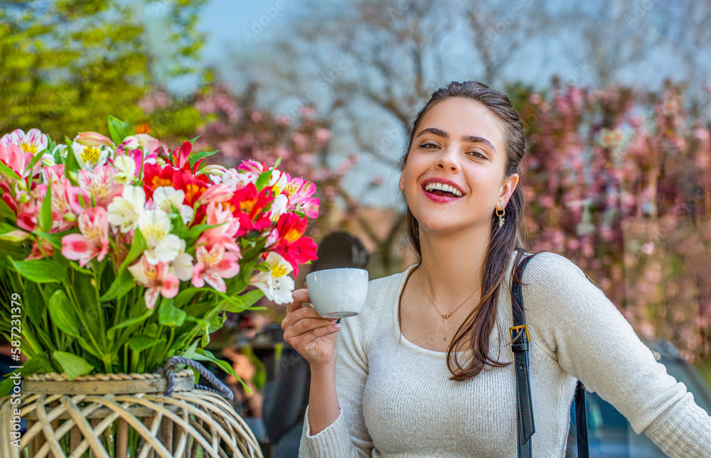Beautiful woman on a cafe enjoying morning with cup of coffee. She holds a cup, laughing, spring flowers. Woman drink coffee. Spring woman fashion concept. Morning coffee. Spring concept