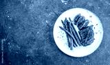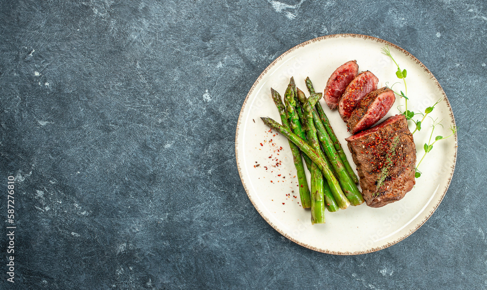 sliced beef grill steak with green asparagus. Healthy dinner or lunch. Long banner format. top view