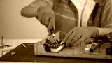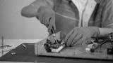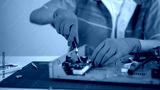 Technician under fixed digital video recorded CCTV board and battery chip by screwdriver test for maintenance is electronic component service concept.