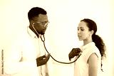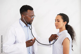 Black male doctor listens to female patient's heartbeat, tells her breathe in