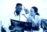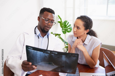 Black male doctor explains x-ray results to young worried patient in office