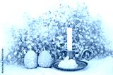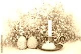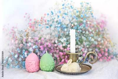 decorative Easter bunny, eggs and candlestick, gentle colorful flowers close up on blurred light background. Easter holiday, Ostara concept. festive composition for spring season. greeting card design
