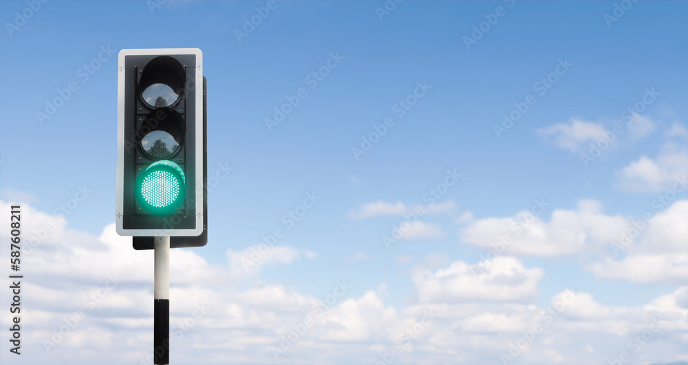 Junction traffic light with green bright open to start, running and go a head, or permit allow passing, blue sky background