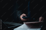 businessman looking at report on mobile and analyzing data with technology in business investment