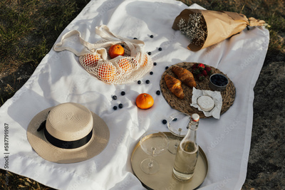 Picnic blanket with delicious food and wine outdoors on sunny summer day. Leisure and relax concept - close up of food and drink.