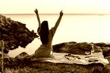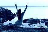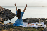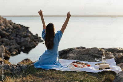 Summer time at the sea. Romantic picnic on the beach with wine, berries and croissants. Woman sitting on the beach with hands up and enjoying free time.
