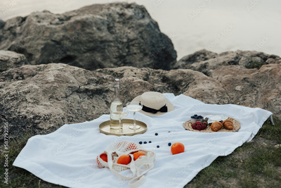 Delicious picnic with strawberries, blueberries, croissants. oranges and white wine.