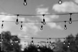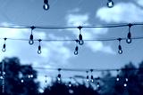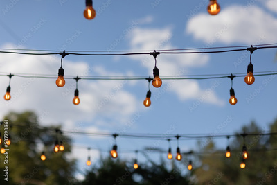Garland of light bulbs on the background of trees and blue sky. Light bulbs decor outdoor for party.