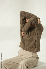 Fashion portrait of young woman in brown winter sweater and beige wide pants on the white background