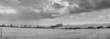 Panoramic view of wheat fields, straw stubble in foreground, hills, green soybeans against blue sky with clouds, landscape of agricultural hills.