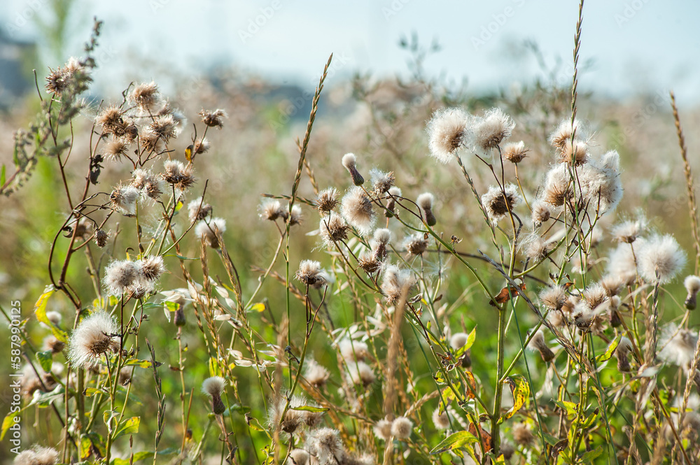 Close up of dry thistle flowers in a wild meadow with blurred background and bokeh sunlight. Abstract natural beautiful pattern with neutral colors