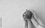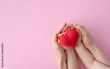 Mother and daughter holding red heart in hands top view. Happy family relationships, love to mom, health care concept.