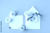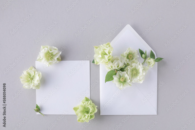 Greeting card trendy mockup or invitation template with empty blank paper sheet and envelope decorated fresh flowers top view and flat lay.
