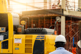 Civil engineer and teamwork inspect construction site of housing development plant. Project manager engineer wear safety helmet working at construction site with blur bulldozer. Construction industry.
