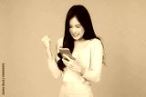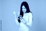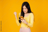 Happy Asian woman holding smart phone with fists clenched celebrating victory expressing success on yellow background Satisfied girl holding mobile phone Young lady looking at phone with succesfull