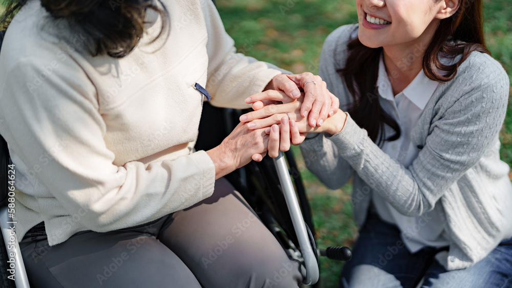 Family relationship, Asian senior woman in wheelchair with cheerful daughter spending time together
