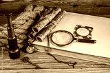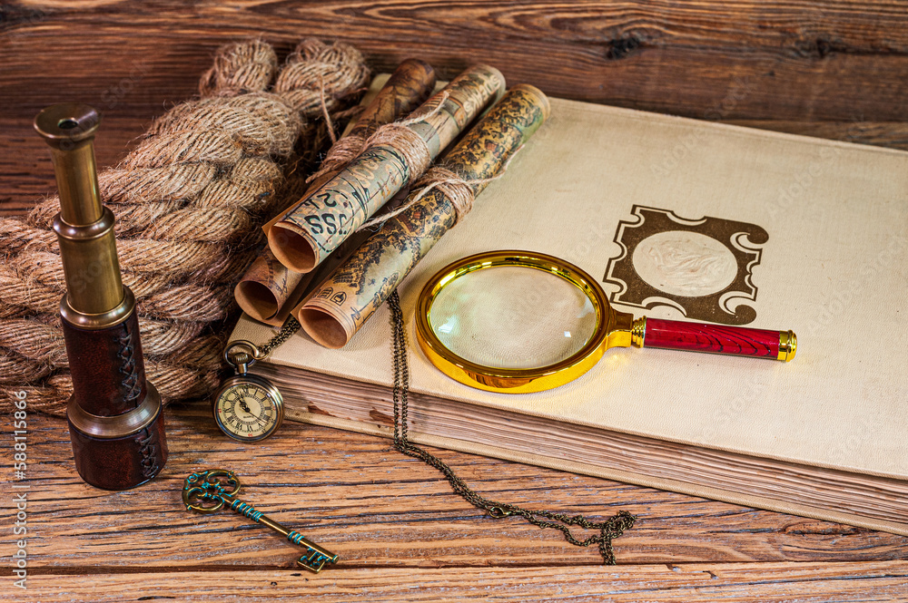 Old items, magnifying glass, map scrolls, pocket watch lying on an old book next to a rope, a telescope and an old key
