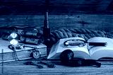 Vintage items, old open books, compass, old maps, tobacco pipe, magnifying glass, telescope, rope, old keys and pocket watch lying on wooden boards.