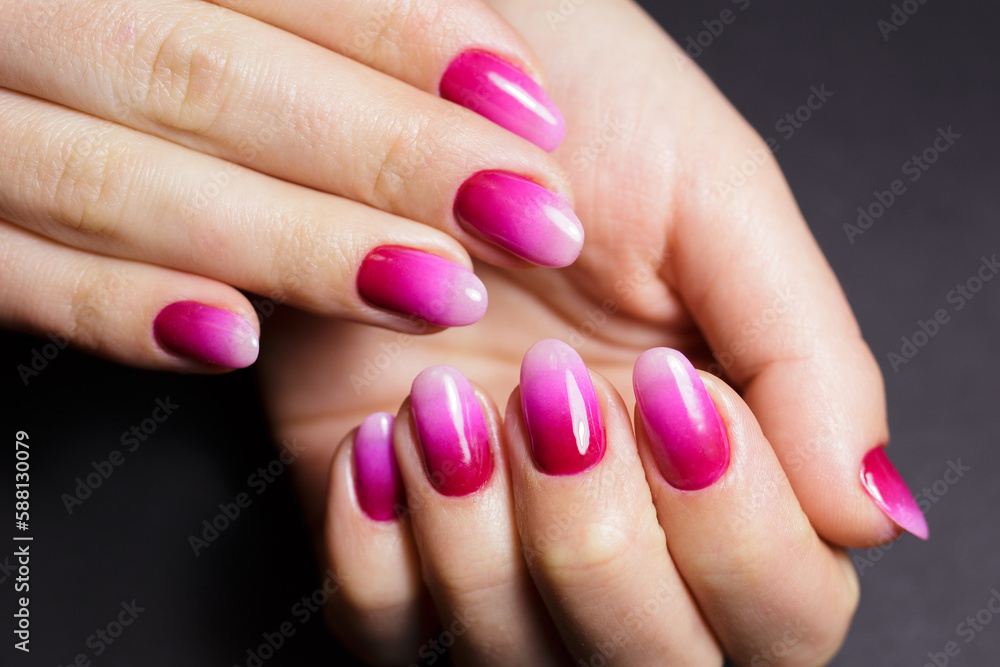 Nail design, manicure with gel polish. Women's hands with a gradient pink manicure.