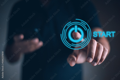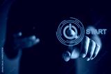 Hand point finger press start button. beginning goal new target. click control success business digital.