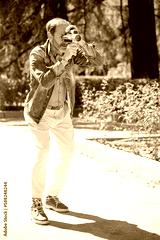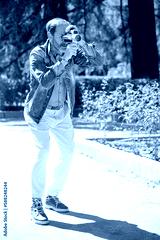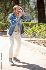 attractive middle-aged photographer concentrating on taking photos in the park with a vintage camera