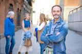 middle-aged man posing for camera with his group of friends behind him