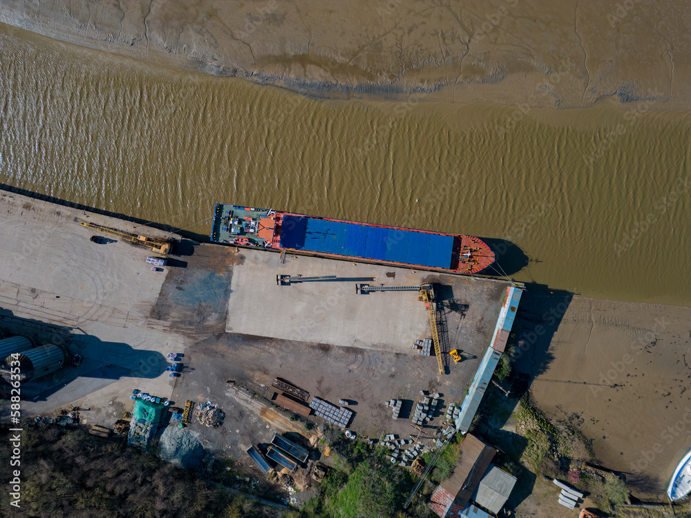 An aerial view of a cargo ship docked on the River Stour at Mistley in Essex, UK