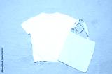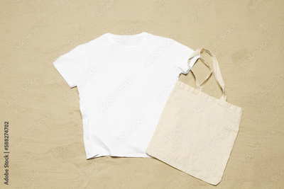 Mockup white not wrinkled summer t-shirt shopper copy space. Sand beach texture background. Blank template woman man shirt Top view. Summertime accessories. Flat-lay closeup tshirt. Beachtime