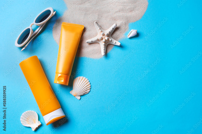 Sunblock bottles, starfish and sunglasses