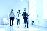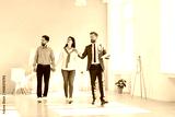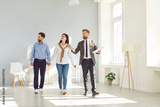 Young couple following a real estate agent who is giving them a tour around a big house, showing all the rooms and telling about all the advantages of living here. Buying house or apartment concept