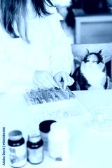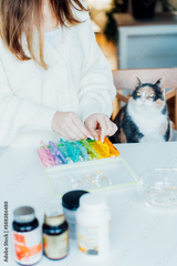 Woman sorting pills into pills organizer with her cat on the kitchen. Pill box with daily doses of medicines. Antioxidant diet vitamin supplements for health and beauty care, biohacking concept.