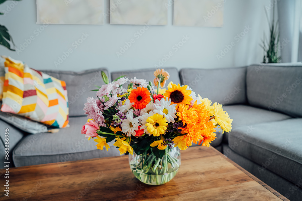 Vase with huge multicolor various flower bouquet on the coffee table with blurred background of modern cozy light living room with gray couch sofa. Giving flowers. Mother's day, birthday gift.