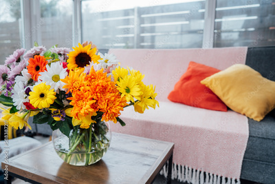 Vase with huge multicolor various mixed flower bouquet on the coffee table with background of modern cozy light conservatory room with couch sofa and bright cushions. Fresh flowers in interior.