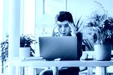 Middle aged shocked business woman sitting in front of laptop looking at screen at her workstation in office. Frustrated worried face expression emotion feelings problem perception reaction