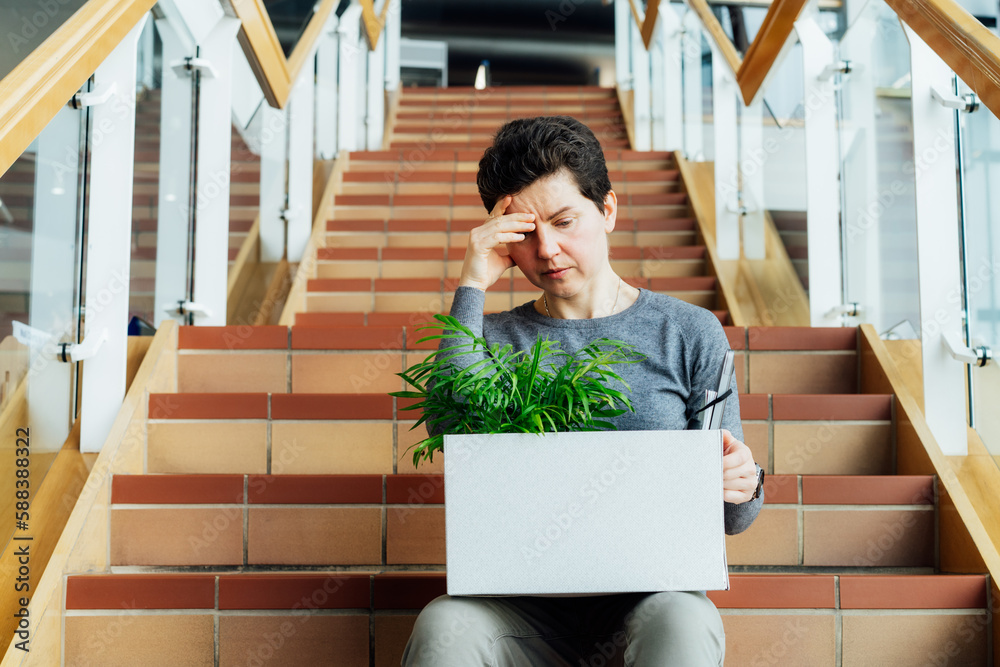 Stressed worried middle aged gender neutral woman with box of personal items sitting alone on the staircase after being laid off from job due to recession and economic stress. Equality discrimination