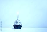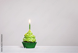 Green cupcake with sprinkles and lit birthday candle on a white grey background.