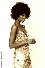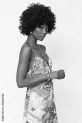 Fashionable African woman with curly hairs and floral dress on isolated white background.
