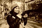 Young photographer woman smiling and shooting a picture on a weekend trip. Happy asian girl having fun taking a photo shot to old building with a vintage professional camera on a travel in Europe