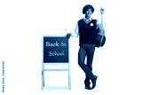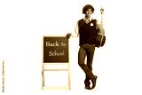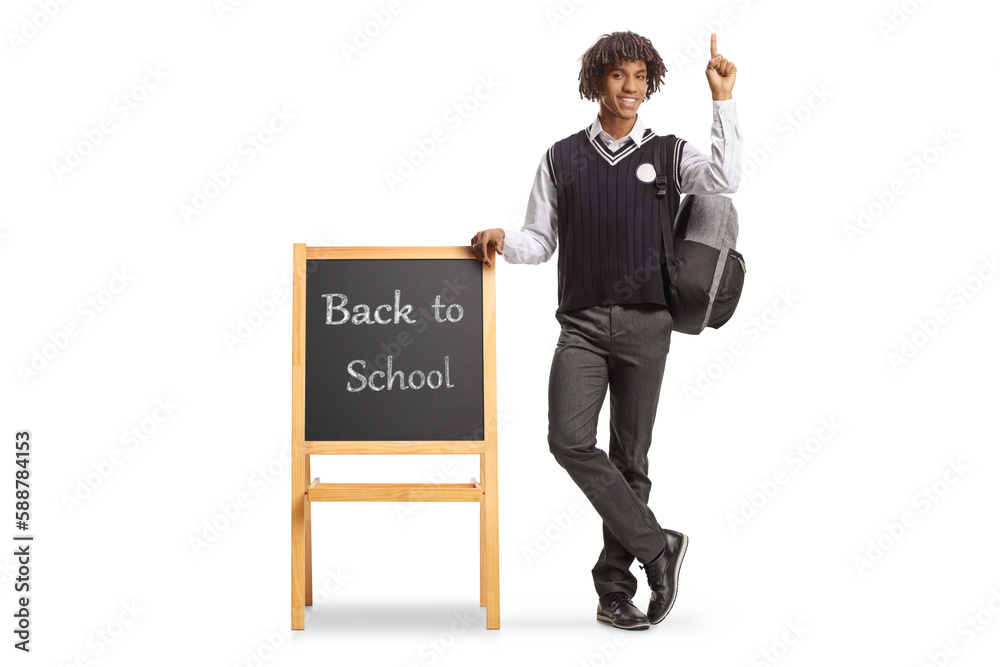 African american student in a uniform leaning on blackboard with text back to school and pointing up