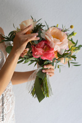 Wedding bouquet in the hands of the bride. Decorated with roses, peonies and ornamental plants.
