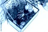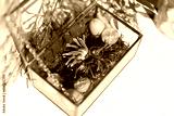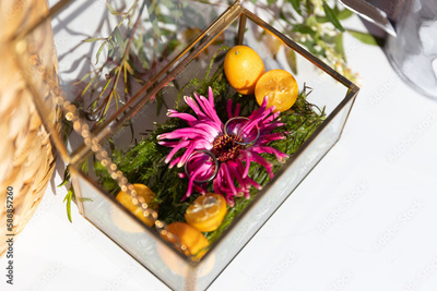 Close up view of wedding rings in transparent box with flower and citrus inside.