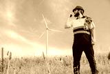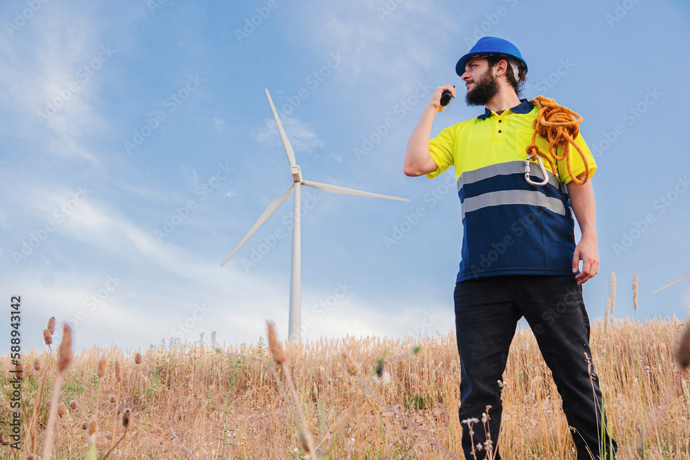 Winmill engineer or sustainable power technician working and talking by walkie-talkie for repair the turbine and the generator. front view of professional of renewable energy. High quality photo