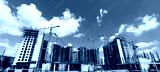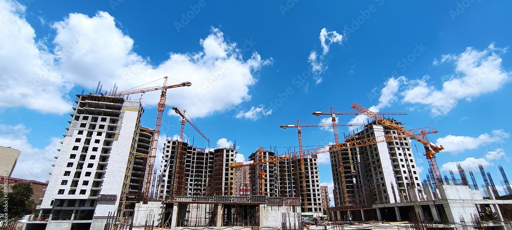 many cranes on building site - construction cranes on blue sky. Residential apartment construction site. Construction site. Big industrial tower cranes with unfinished high raised buildings.