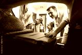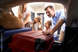 Caucasian family of four packing luggage into car trunk for holiday