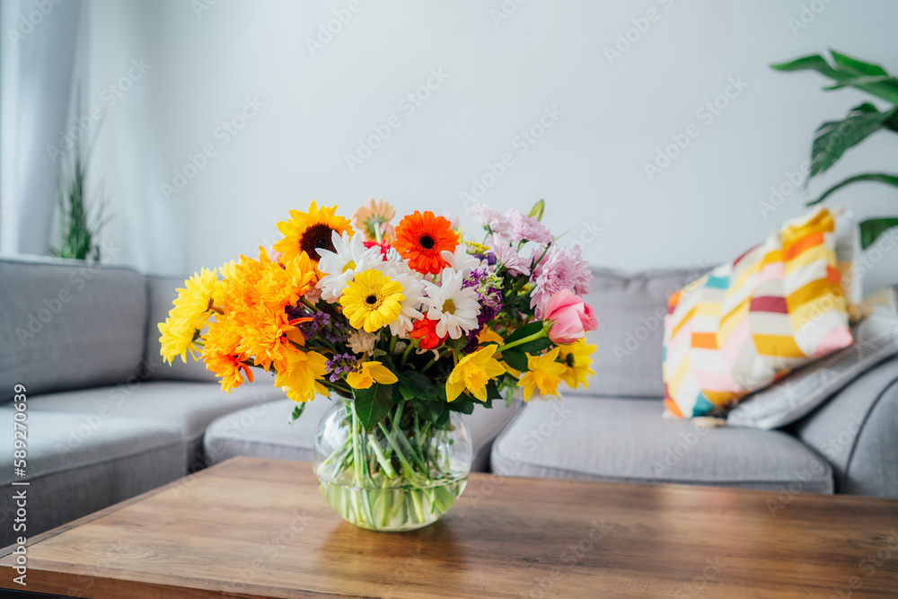 Vase with huge multicolor various flower bouquet on the coffee table with blurred background of modern cozy light living room with gray couch sofa. Giving flowers. Mother's day, birthday gift.