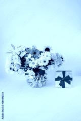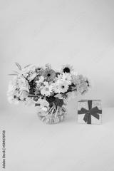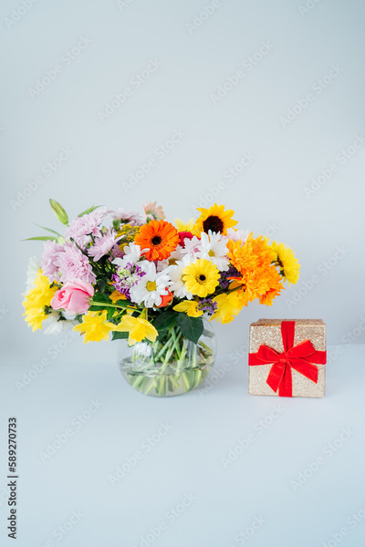 Round Vase with huge multicolor various mixed flower bouquet and shining golden gift box with red velvet ribbon on the white background. Mother's day, women day, birthday gift. Vertical card.