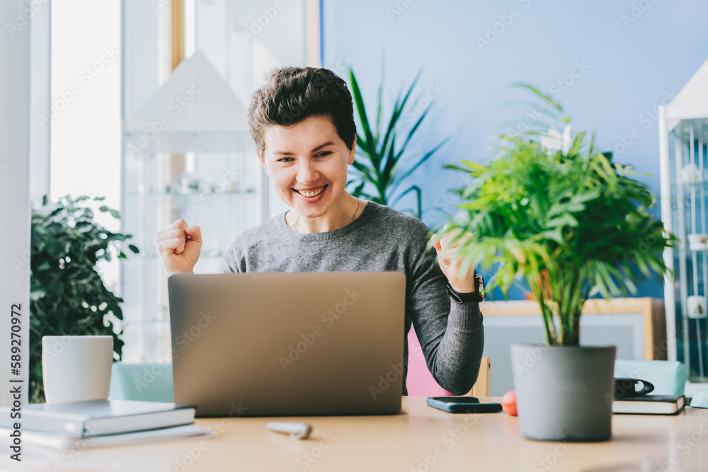 Excited happy middle aged neutral gender woman feeling winner rejoicing online win got new job opportunity, overjoyed motivated girl doing yes gesture, receive good results on pc celebrating admission
