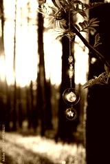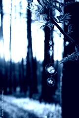 suncatcher Crystal prism on abstract blurred sunny natural forest background. Magic crystal Ritual, Witchcraft, esoteric practice for harmony, calm soul, productive the mind. Feng Shui, reiki therapy