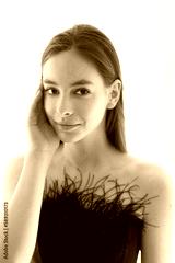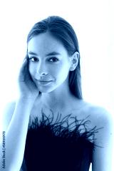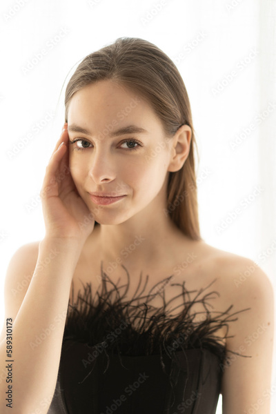 Beauty young woman with perfect face on window curtains background.