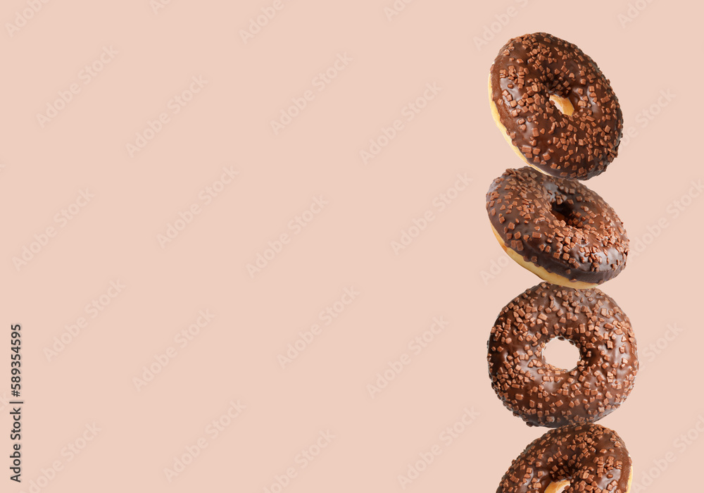Tasty chocolate donuts with sprinkles on beige background, space for text